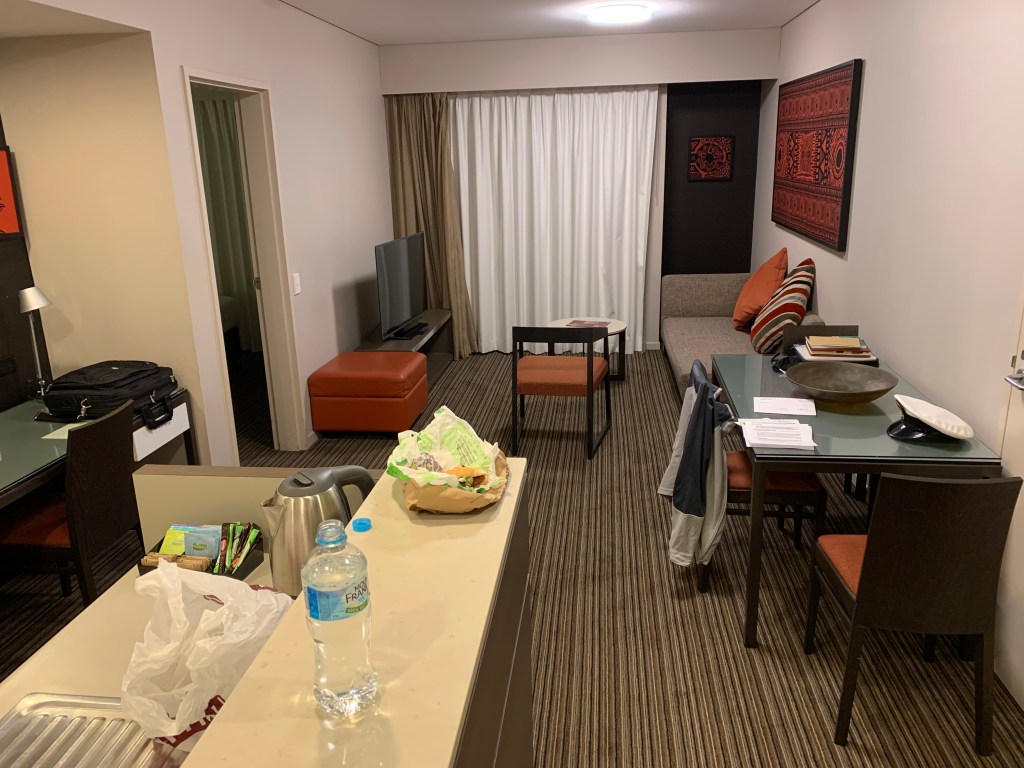 While I was in the shower later my mobile rang, I answered it but couldn’t hear anyone but I did hear a faint voice from the other room. I went to investigate and couldn’t see anything then realised someone was at my door. I opened the door, still wet from the shower and holding a towel around me, to find two guys standing there. They asked me kindly to go and get dressed while they waited outside. One was from NT health department and the other was an NT police officer. They asked if I had any COVID-19 or flu like symptoms, then informed me of the process for the next fourteen days. They also said to expect a phone call on the room phone from NT police at any time during the day to check on me.